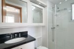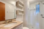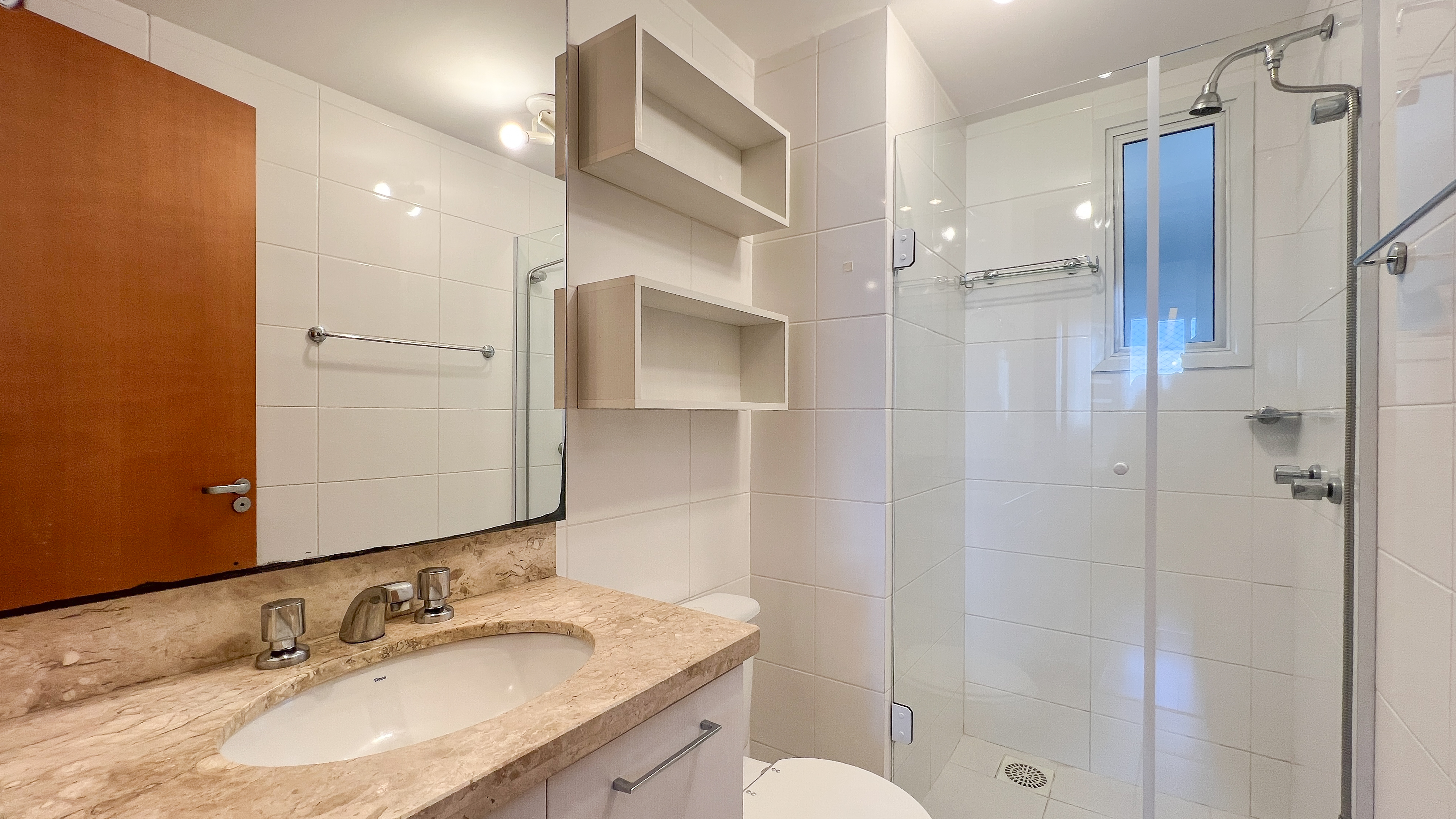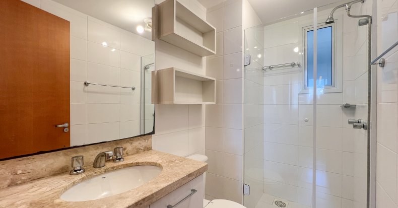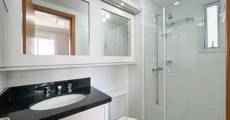 - Banheiro social com box de vidro e bancada em granito