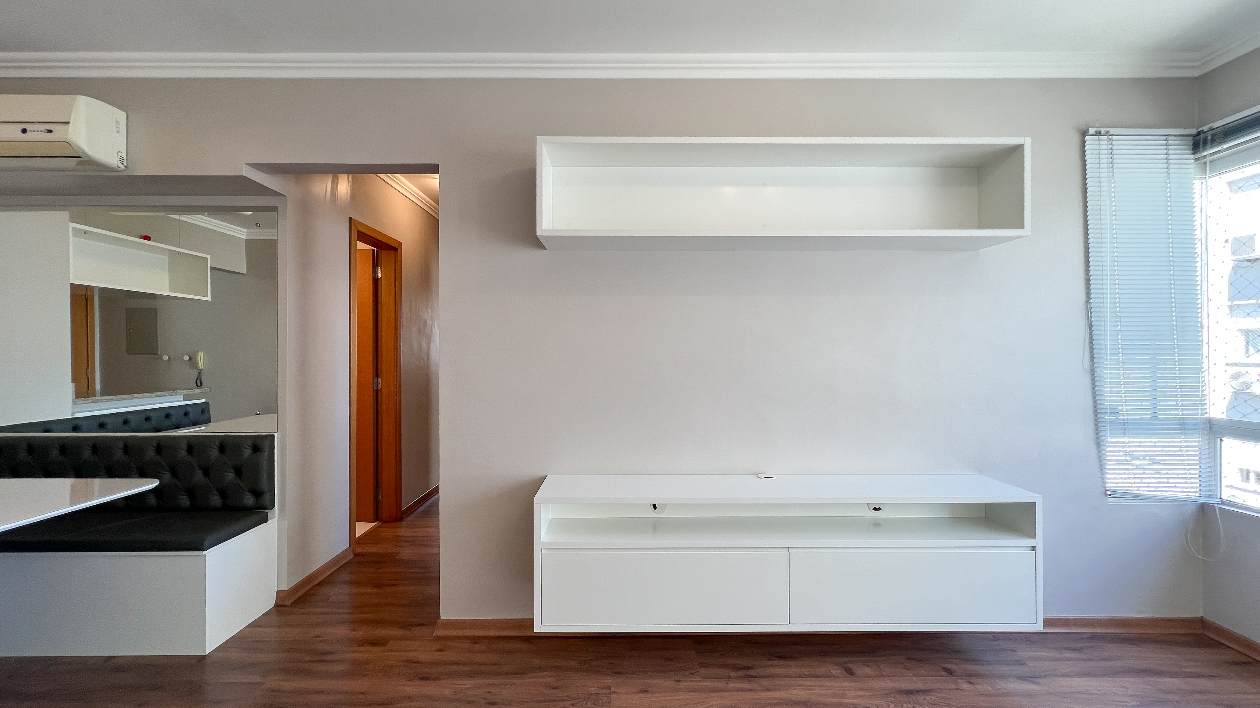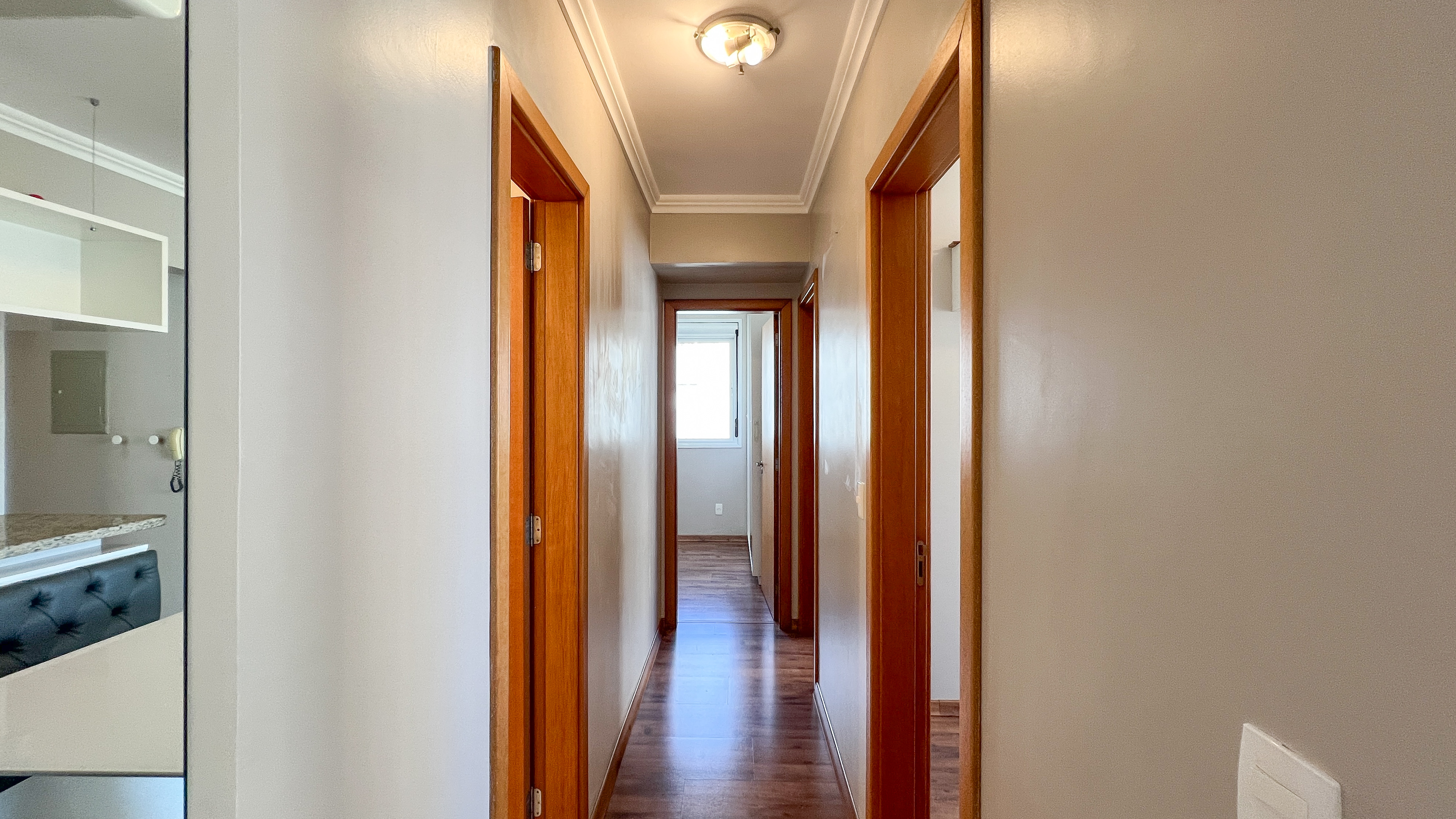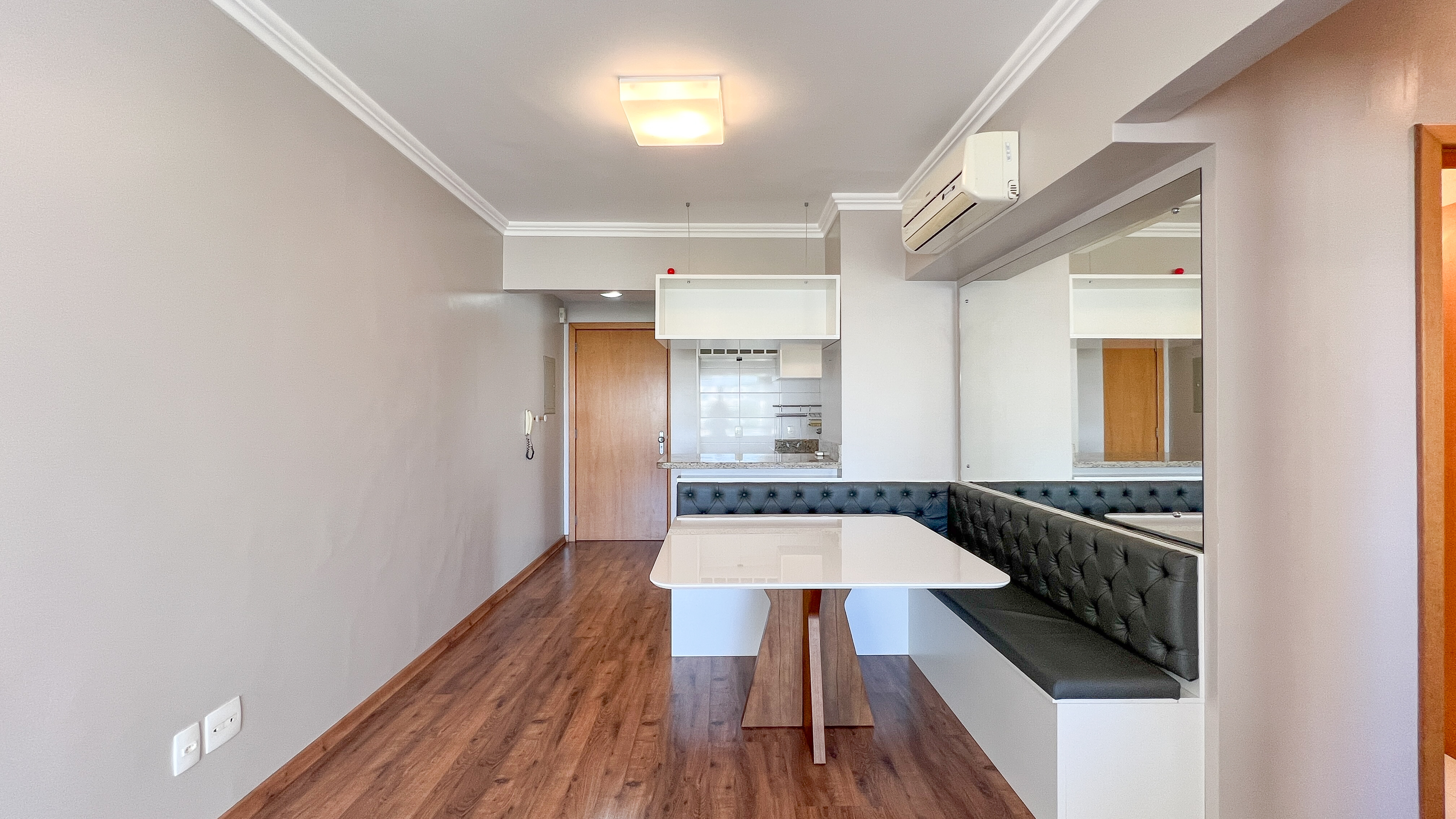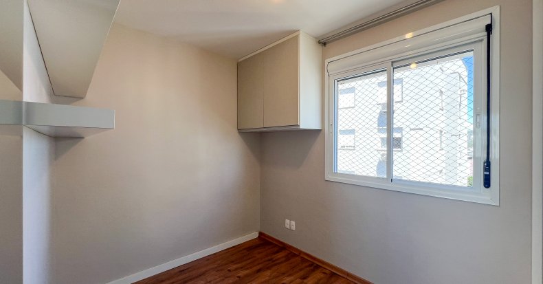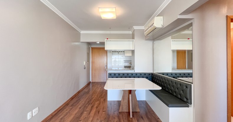 - Piso em madeira laminada em todos os ambientes, proporcionando elegância e praticidade